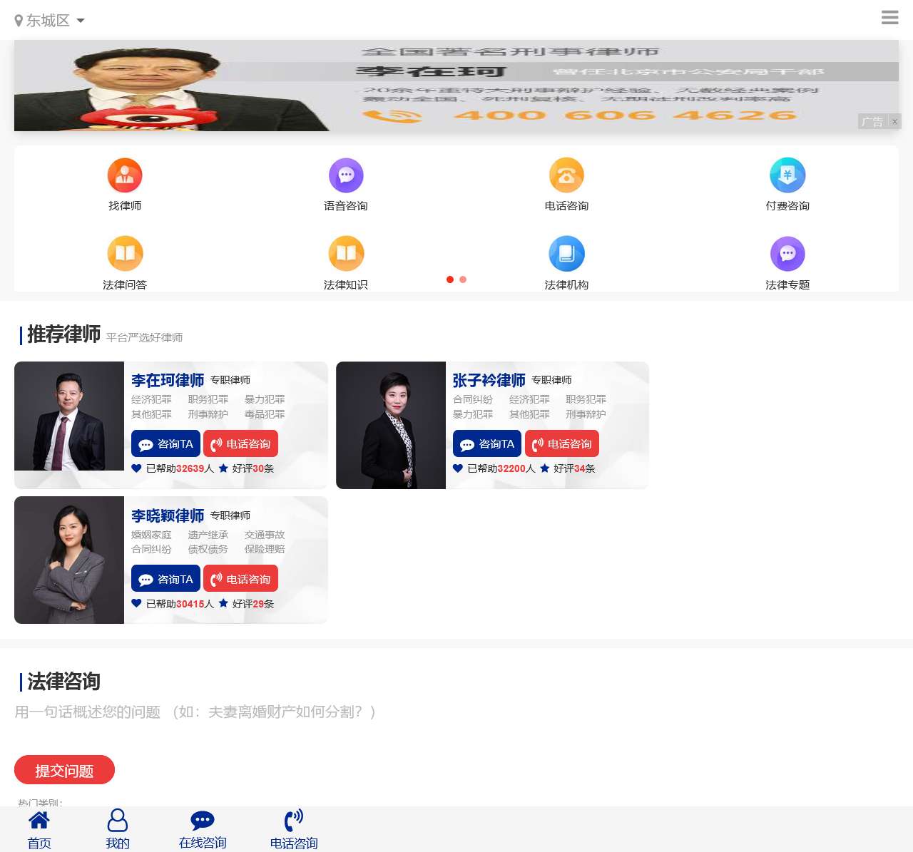 | 电话咨询 | 提供电话咨询服务,用户可以通过电话与律师直接沟通。 |