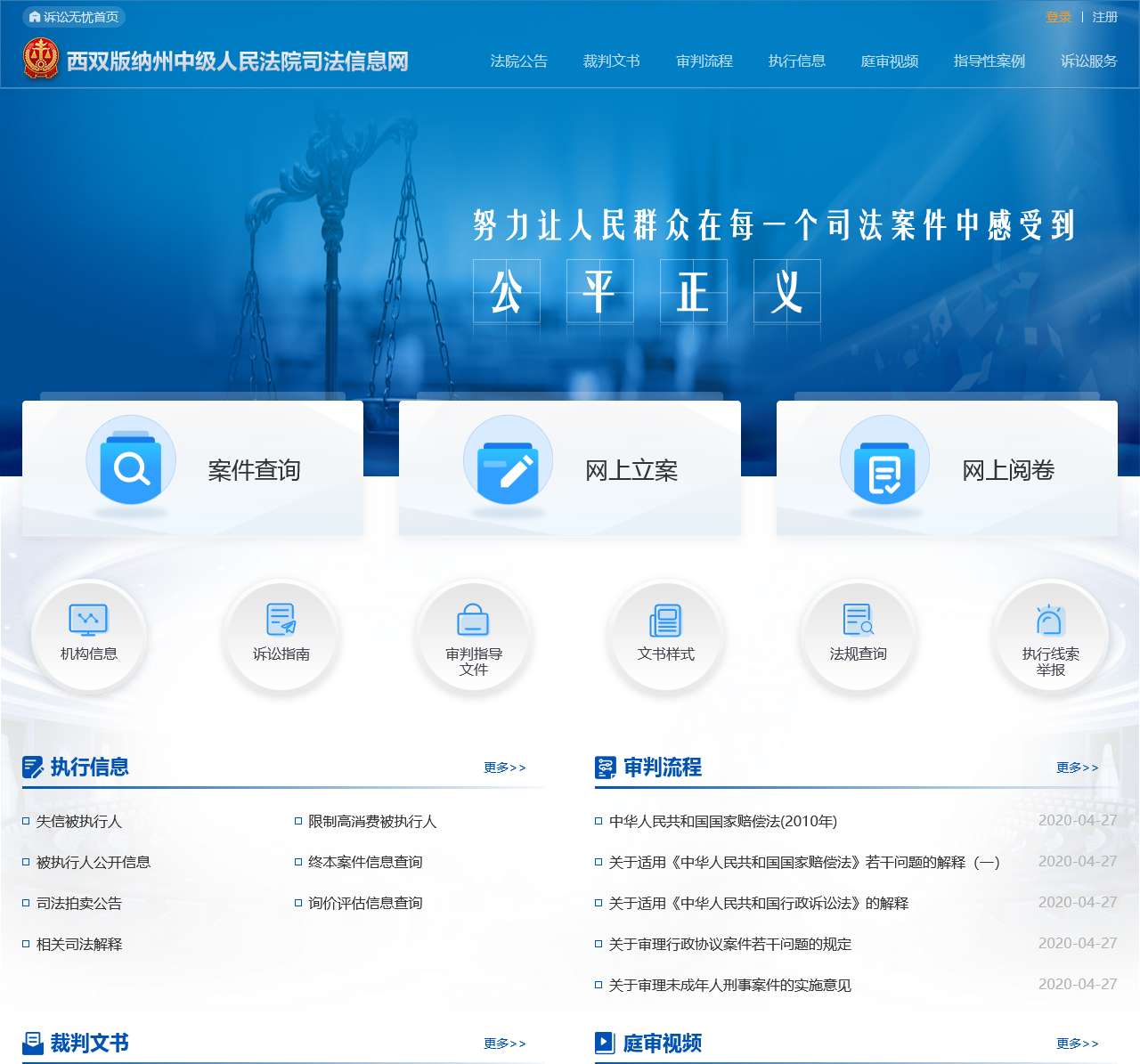 | 诉讼服务 | 案件查询、网上立案、网上阅卷、诉讼指南、审判指导文件、文书样式、法规查询、执行线索举报 |