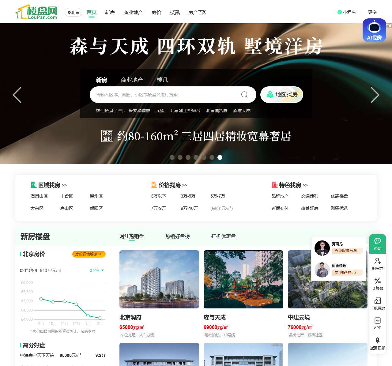 北京楼盘网是专业的房产网站,为大家精心推荐北京新房、二手房、租房、商业地产、公寓商铺等房地产信息,通过提供实时变动的房产价格走势及专业的买卖服务,为您在北京找一个新家。