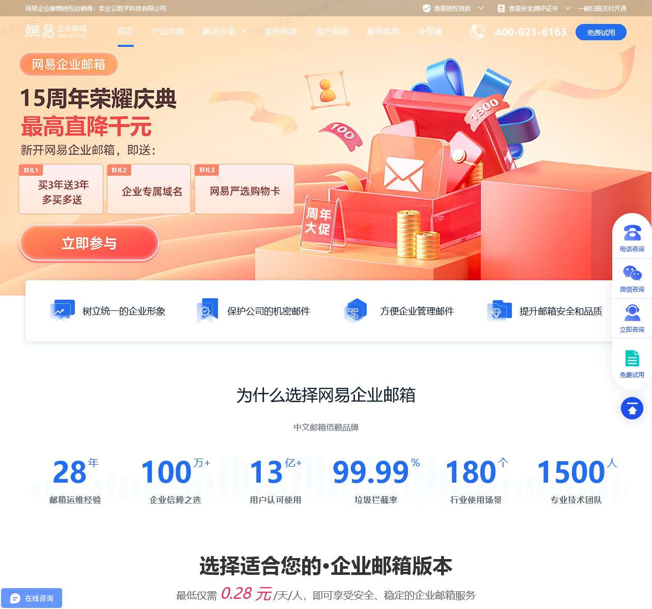江苏奕企云是网易授权经销商,主要为企业提供网易企业邮箱申请及购买,163企业邮箱注册,开通入口,专注企业邮箱运维24年,现在开通即可享受买3年送3年,买5年送5年的优惠活动!
