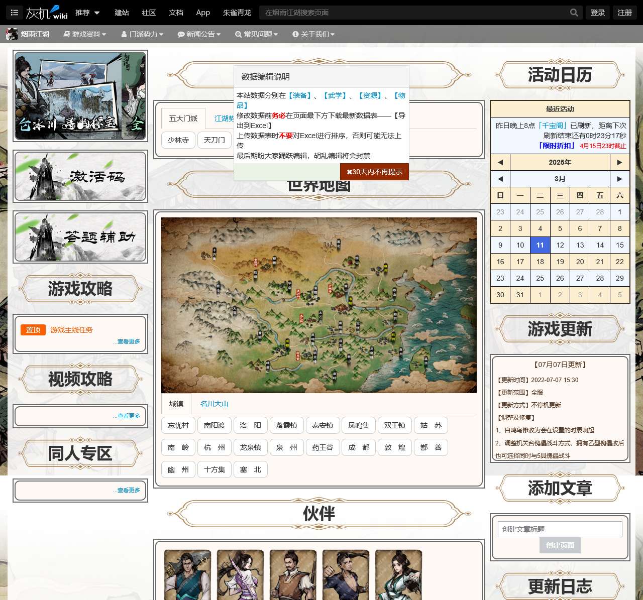 | 城镇 | 名川大山、忘忧村、南阳渡、洛阳、落霞镇、泰安镇、凤鸣集、双王镇、姑苏、南岭、杭州、龙泉镇、泉州、药王谷、成都等 |