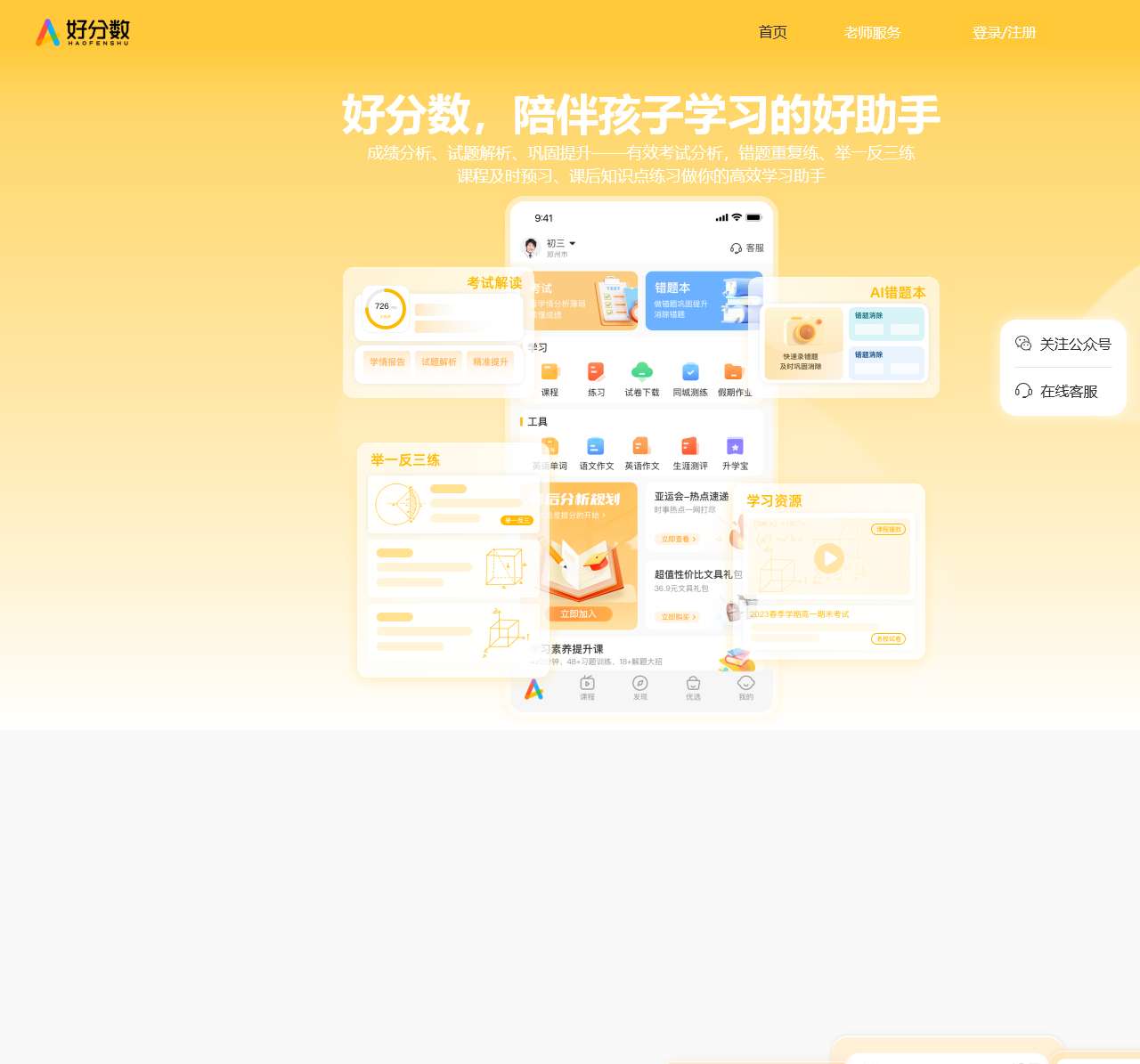 好分数关注成绩,更关注提升,是超4500万学生的智慧学习方式!平台依托学校的考试及诊断数据帮助学生精准定位学习薄弱,从学、练、测三个维度找到学习方法、学会自主学习、做到考后有提升,实现持续进步。