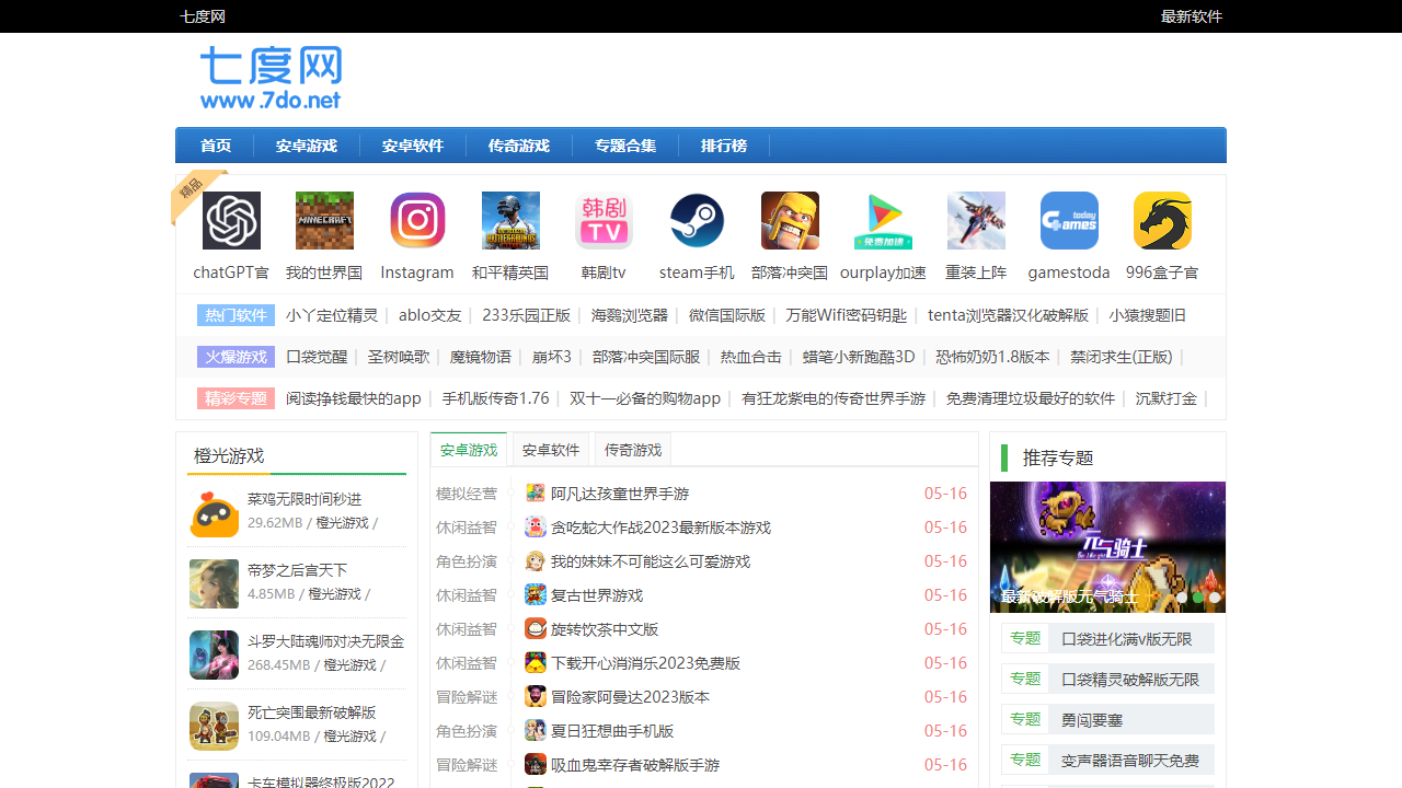 七度网(www.7do.net)是国内知名的下载基地,为广大用户提供2022最新的免费安卓游戏、安卓软件下载,其中包含汉化游戏软件、破解游戏软件、海外游戏、街机游戏等等,旨在让用户找到所需的下载资源。