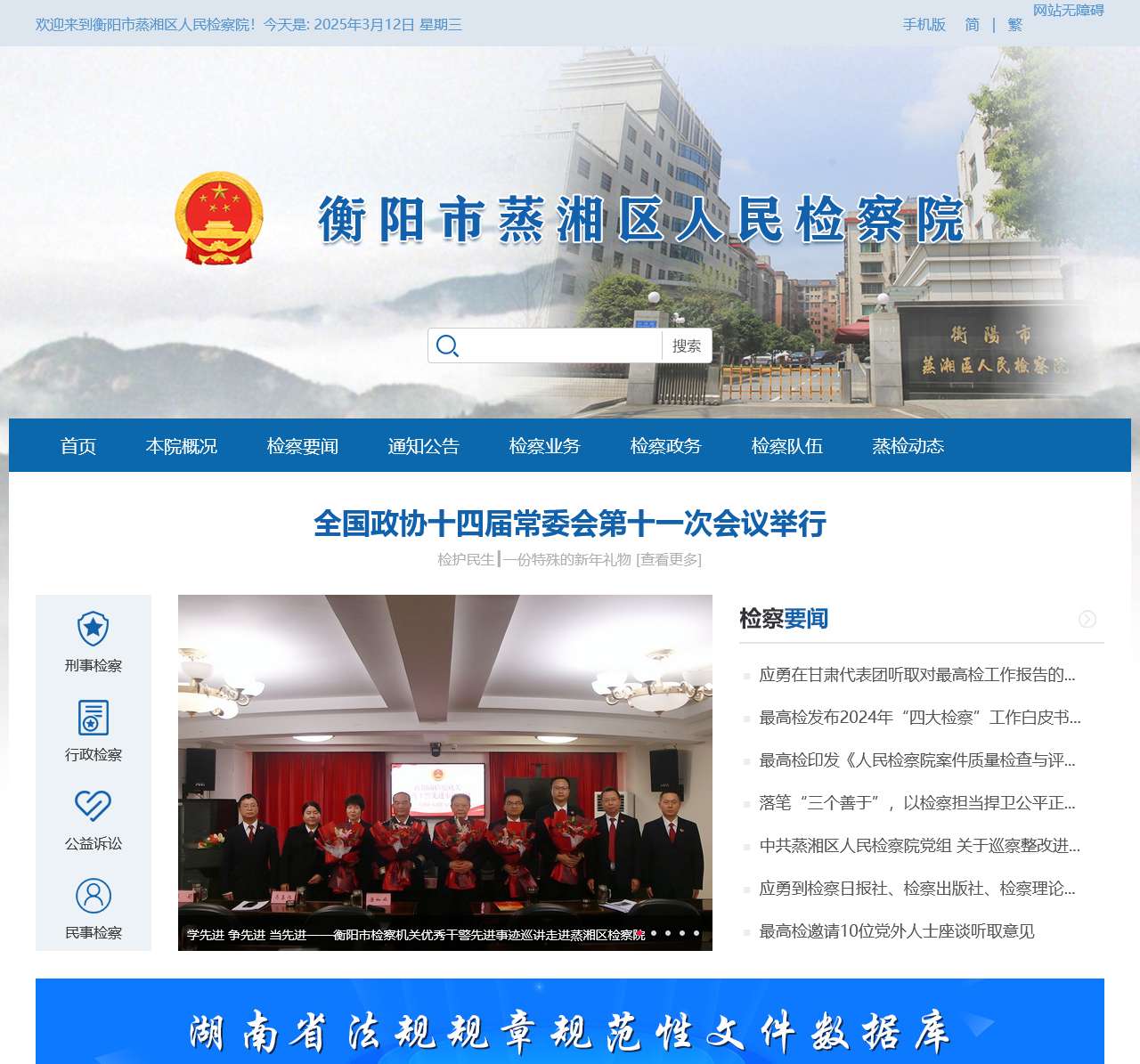 | 检察要闻 | 重大会议报道、检察动态、媒体关注 | 包括检察日报及其他媒体的报道、蒸湘检察院重大的动态与活动。 |