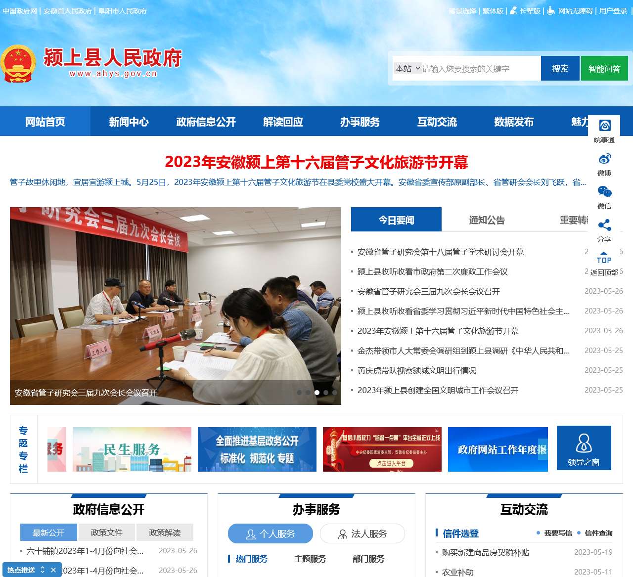 中国颍上网站提供了丰富的信息和服务,涵盖了新闻动态、政府信息公开、办事服务、互动交流等方面。其中,2023年安徽颍上第十六届管子文化旅游节开幕以及安徽省管子研究会的学术研讨会和会长会议等活动突出了颍上县在文化和旅游领域的重大地位。同时,政府部门的工作会议和公告也展示了政