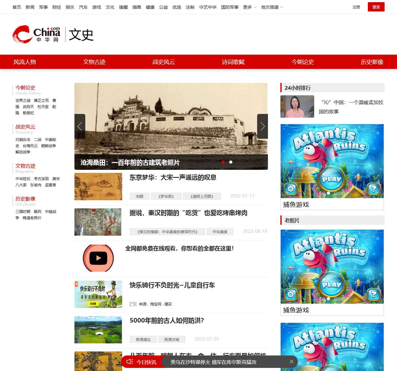 | 历史 | 文史、风流人物、文物古迹、战史风云、诗词歌赋、历史影像、中华姓氏、考古发现 |