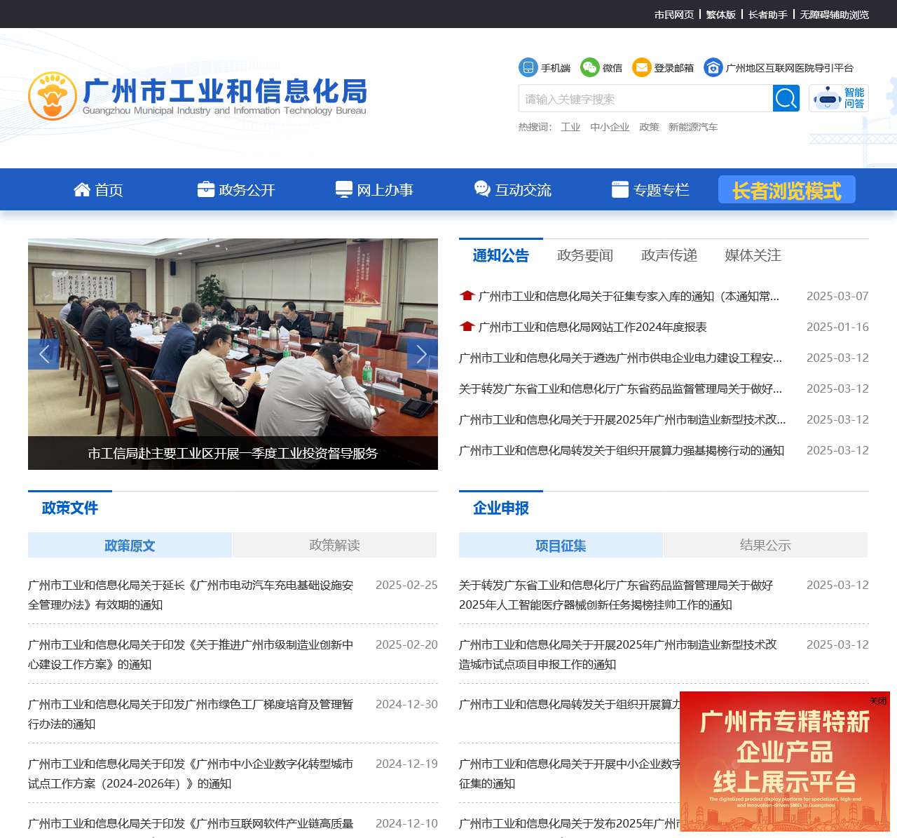 广州市工业和信息化局网站(http://gxj.gz.gov.cn/)是广州市工业和信息化局主办、广州市工业和信息化产业发展中心承办的政府网站,是广州市工业和信息化局政务信息公开的平台。网站分为首页、政务公开、网上办事、互动交流和专题专栏等栏目,从发布解读、办事服务、互动交流和功能设计等方面,不断加强信息内容建设和发布规范化。