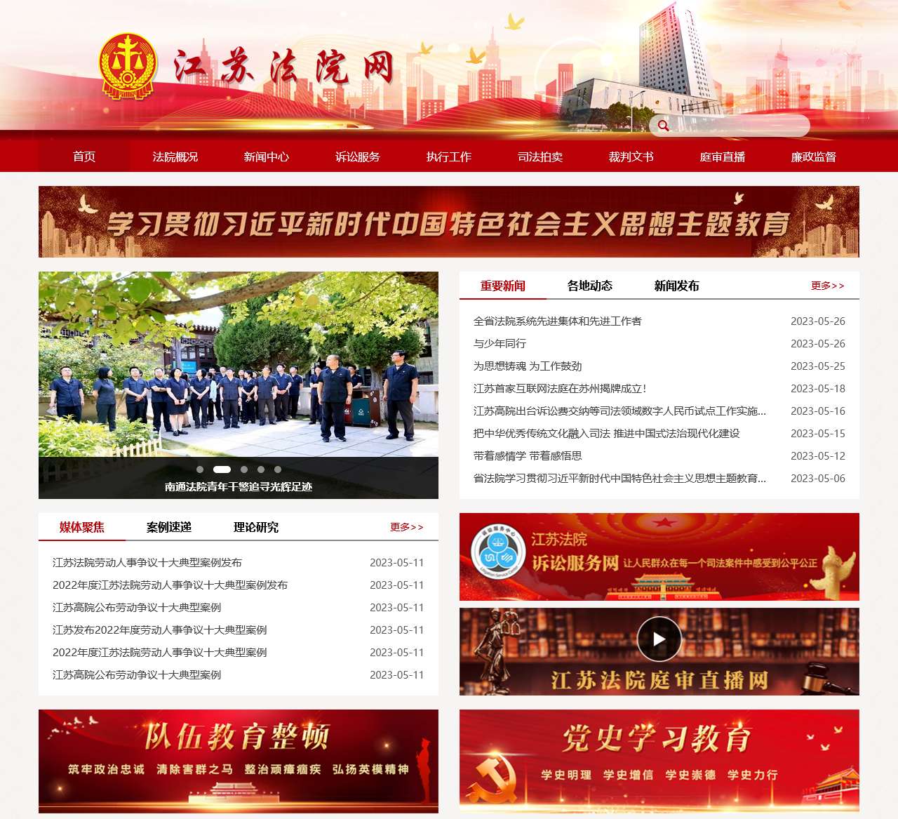 以上是江苏法院网首页的主要内容,包括法院概况、诉讼服务和媒体聚焦等方面的信息。用户可以通过该网站获取法院系统的最新动态、查询裁判文书、观看庭审直播以及了解司法新闻和活动等内容。