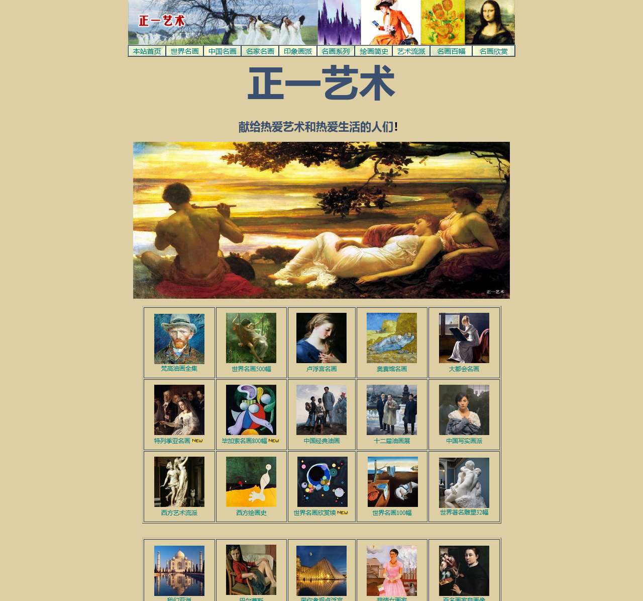 世界名画,艺术画廊,天下名胜,迷人风光,经典摄影,社会写真,神奇幽默,精彩纷呈,正一艺术,真正一流的艺术网站。站长寄语:我只把我喜欢的,轻轻地放到网上;追求画质品位,兼顾知识情趣;不求最多最全,但求你有所获。