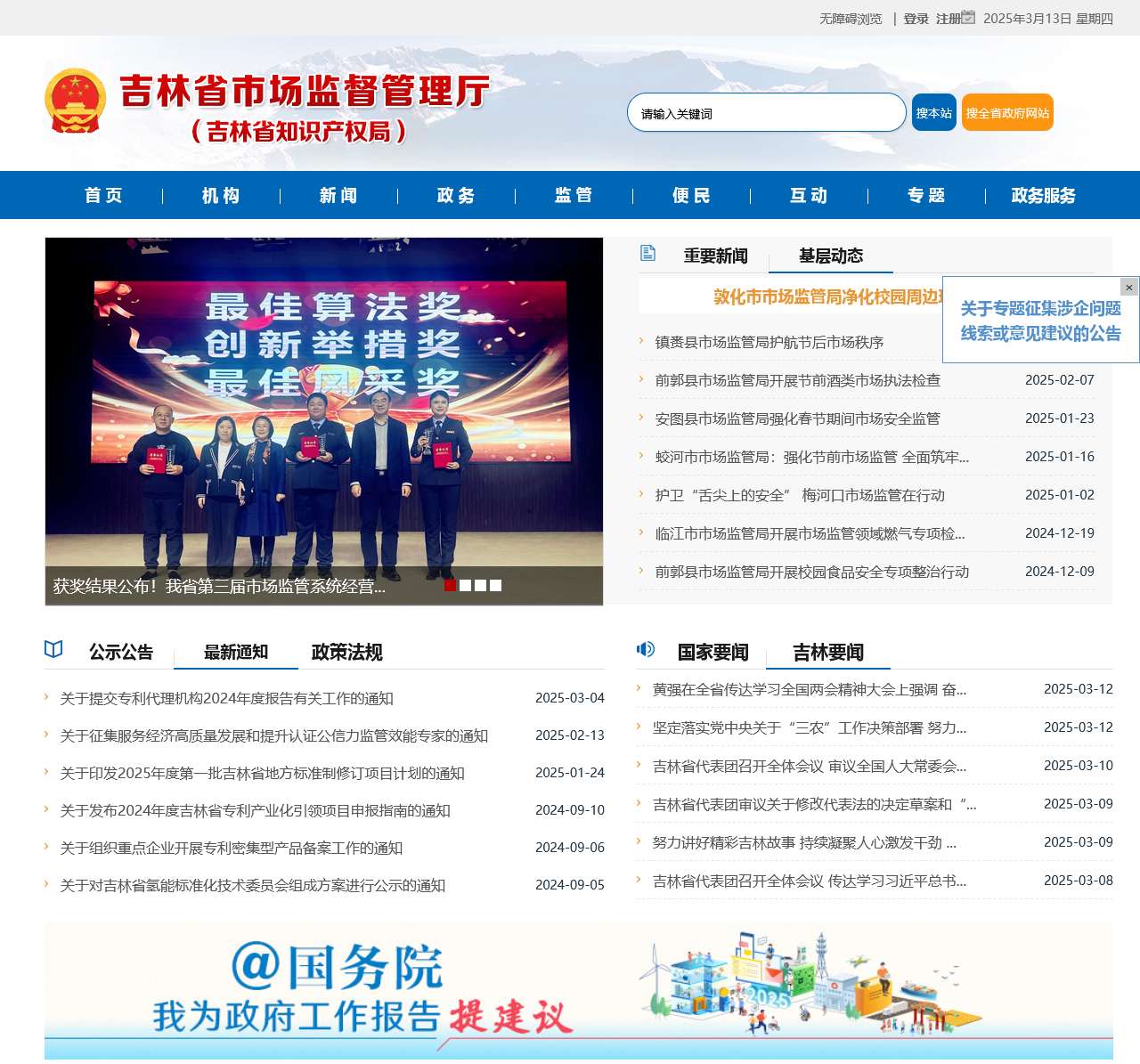 | 食品安全与质量监督 | 食品抽检: “3·15”+“你点我检 服务惠民生”食品安全专项,吉林省市场监督管理厅关于食品不合格情况的通告,吉林省羽绒服产品质量专项监督抽查,2024年吉林省车用油品产品质量专项监督抽查结果信息通告等 |
