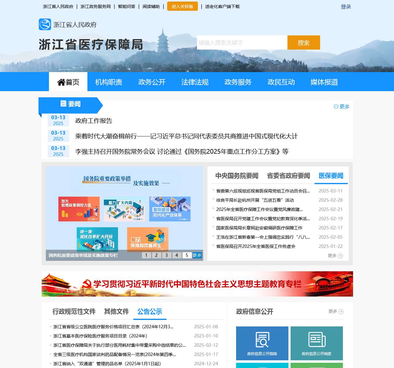 | 最新政策与活动 | 国务院政策举措、浙江省医疗保障局各类工作会议、活动报道、政府工作报告等 |