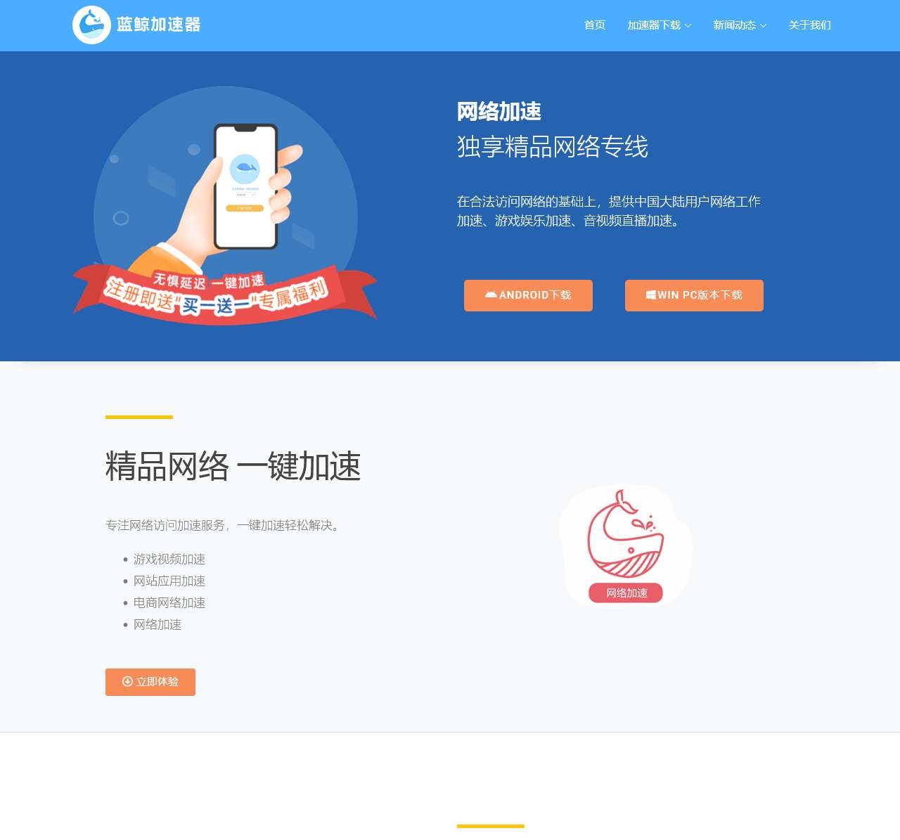蓝鲸加速器是一款专业的国外网络加速器,提供跨境网络加速,外网加速,游戏加速,独享海外精品网络专线。