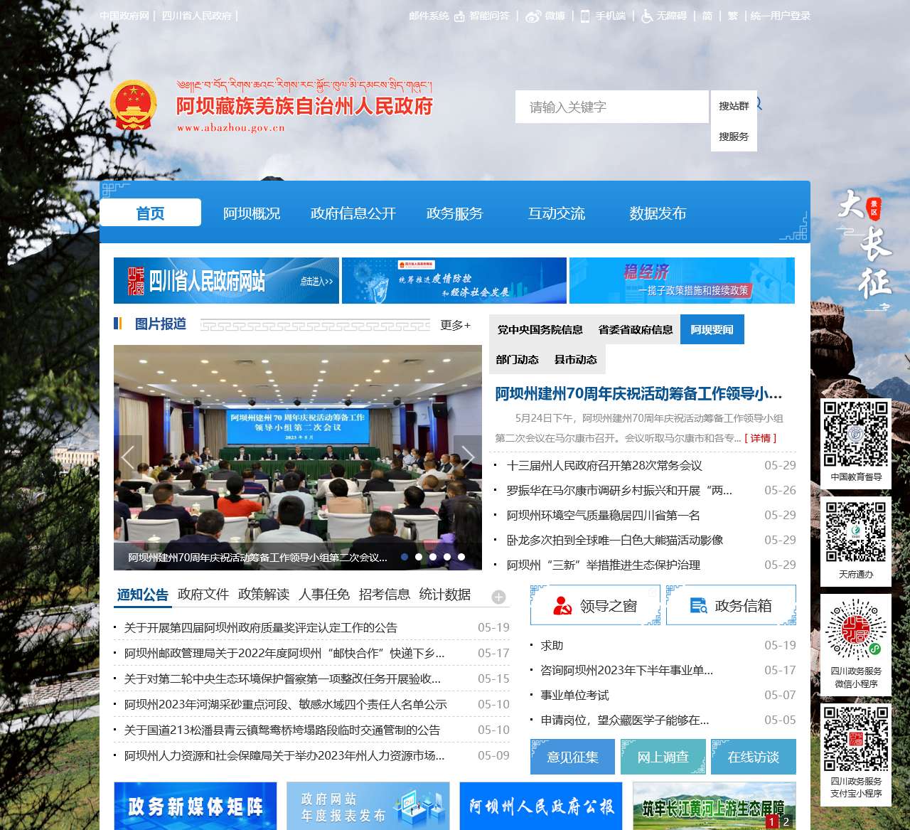 中国阿坝州是中国四川省的一个地级行政单位,下辖多个县市。阿坝州拥有丰富的自然资源和独特的自然风光,吸引着大量游客前来观光和探索。以下是阿坝州政府网站首页内容的整理,以便更好地介绍阿坝州的信息:
