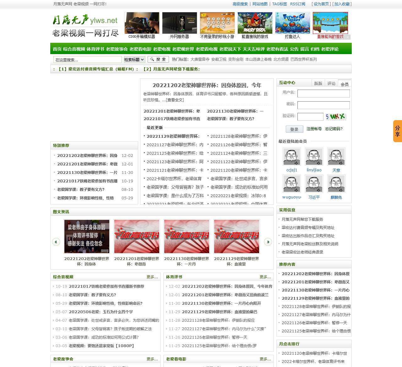 月落无声网专门收集整理梁宏达节目视频,如《老梁通史》《梁知》《老梁故事会》《大唐雷音寺》《老梁说奥运》《老梁观世界》《老梁说天下》《老梁看电视》《老梁故事汇》《老梁体...