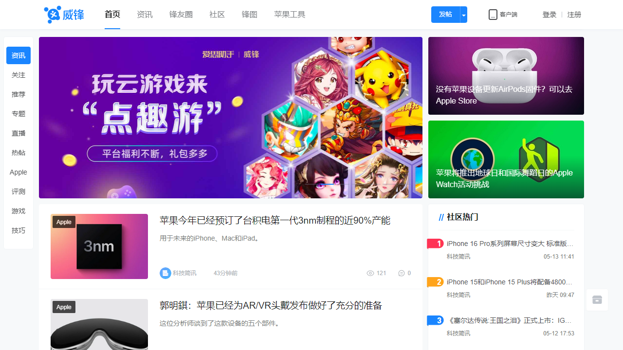 威锋,千万果粉大本营,是中文苹果用户首选的苹果媒体及苹果社区。来威锋,看苹果资讯、讨论当下科技热点、分享玩机心得、优惠购买苹果产品、参与科技酷品试玩活动,获得更多苹果服务。威锋提供7*24小时的苹果资讯,科技原创观点、Apple软硬件、智能硬件评测等,涵盖Apple的iPhone、Mac、iPad、Apple Watch等全系列产品及周边。威锋社区犹如宝藏,沉淀了几亿个关于苹果系统(macOS、iOS)、插件软件壁纸游戏资源、玩机技巧、开箱晒货、摄影、配件硬件等与苹果科技相关的分享讨论。