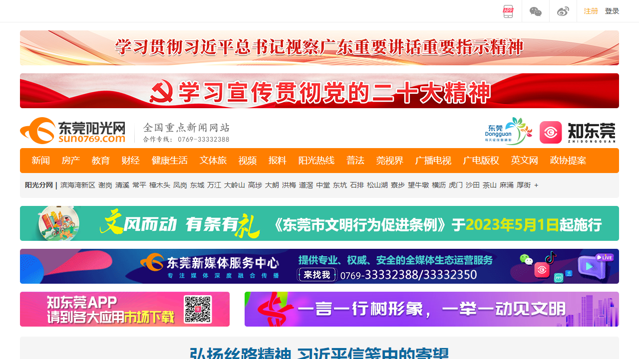 东莞阳光网(www.sun0769.com)开通于2005年12月28日,由中共东莞市委宣传部主管、东莞广播电视台主办,是以新闻资讯为龙头,集专业信息服务和技术服务于一体的区域性强势媒体,是东莞四大媒体之一。,东莞阳光网新闻频道是一个主要为东莞及珠三角地区网民各种新闻资讯服务的大众化专业频道,主要设有《东莞新闻》、《镇街新闻》、《视频新闻》、《阳光网评》、《阳光热线问政平台》和《阳光会客厅》等十二