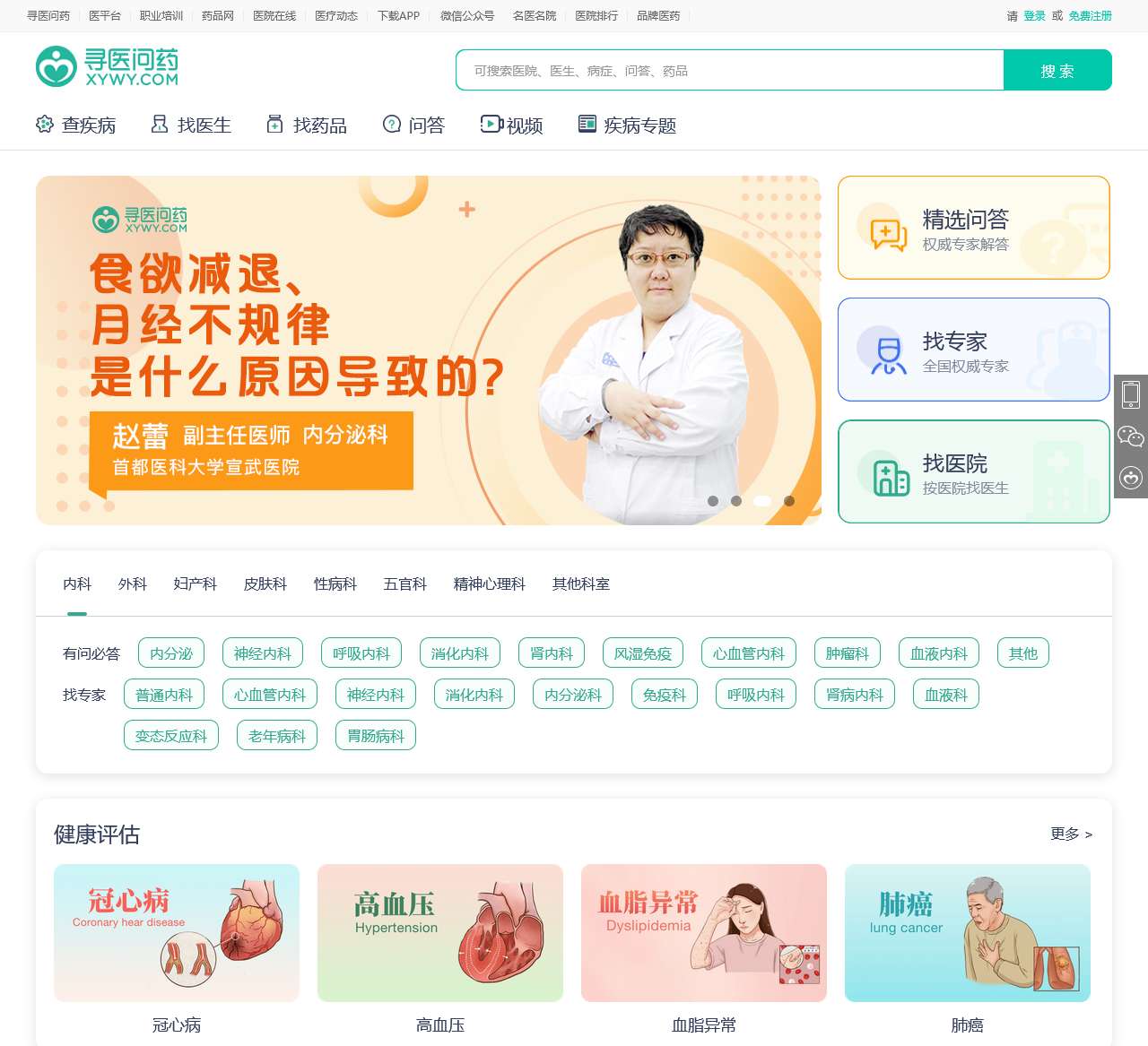 寻医问药网,以为全民健康导航为己任,传播品质生活、健康为先的理念,为患者、医生搭建精准医疗信息查询,一对一在线咨询,预约挂号等服务平台。包括疾病,保健,健康新闻,专家咨询,男科,妇科,育儿,性爱,心理,整形,减肥,药品,中医,美容,饮食,医院查询,医生查询,疾病查询,药品查询,疾病自测等频道。