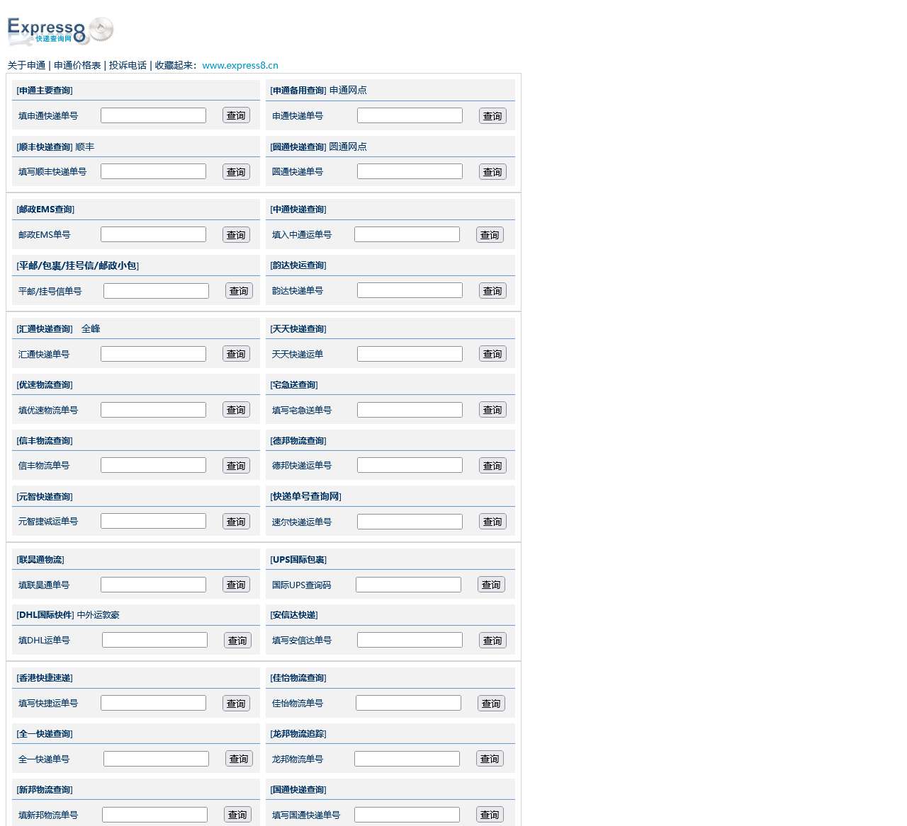 快递单号查询网www.express8.cn,主要提供申通快递查询、中通、圆通、顺丰快递、申通快递单号查询,及其它常用的速递公司电话、申通网点、价格、单号查询!