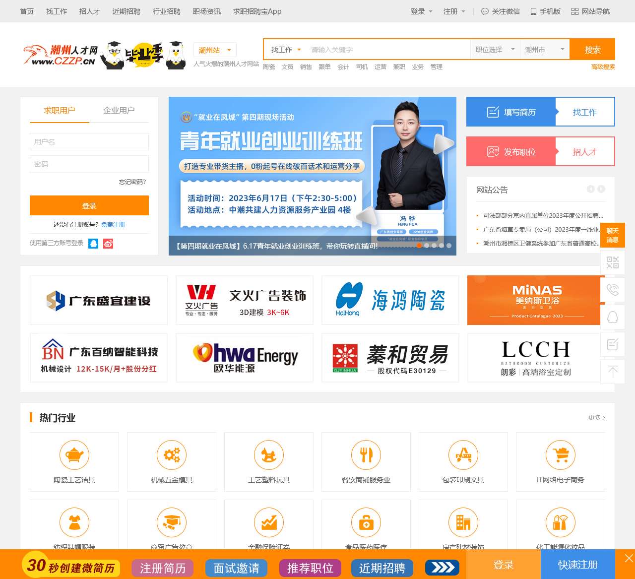 潮州人才网(CZZP.CN)提供潮州人才网最新招聘信息,潮州人才网站中潮州招工最新招聘信息多、更新快的潮州招聘网站,在潮州找工作、潮州招聘网站理想选择,实现一站注册,多站发布的招聘网站,精准、快速、强颈有效的第三方潮州招聘网站!