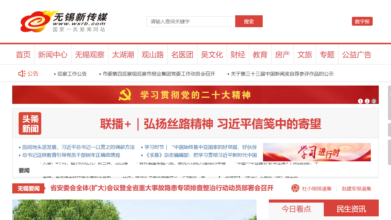 无锡新传媒是一家专注于数字传媒领域的机构,提供丰富多样的新闻内容和资讯服务。该网站主要包含了新闻中心、无锡观察、太湖潮、观山路、名医团、财经、教育、房产、文旅、专题等栏目。