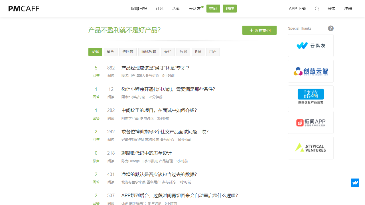 | 产品不盈利就不是好产品? | 最新的讨论话题,用户可以参与讨论 |