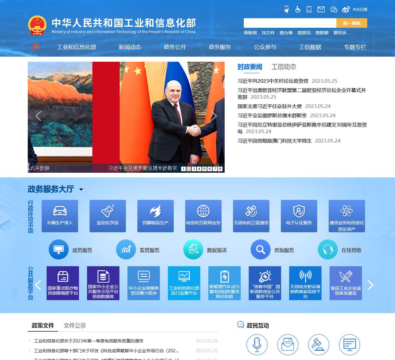 政务服务板块包括车辆生产准入、监控化学品、民爆物品生产、电信和互联网业务、无线电和卫星通信、电子认证服务、通信业务和信息化固定资产等多个服务项目,提供在线办事、查询、报送等服务。