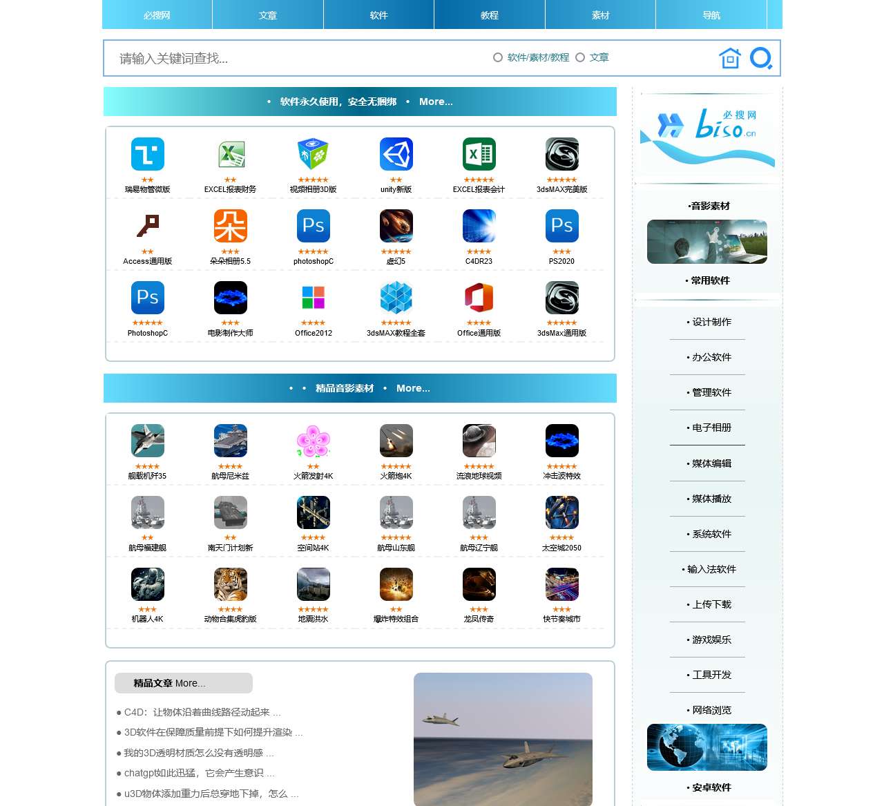 必搜网是一个综合性网站,提供丰富的文章、软件和教程资源,涵盖办公、设计、管理、音视频编辑、系统等多个领域。无论您是在寻找常用软件、设计制作工具,还是需要办公软件、管理软件或者媒体编辑工具,必搜网都能满足您的需求。另外,它还提供高端视频素材、3D教学/模型等资源,让您能够找到更多精品的软件和素材。