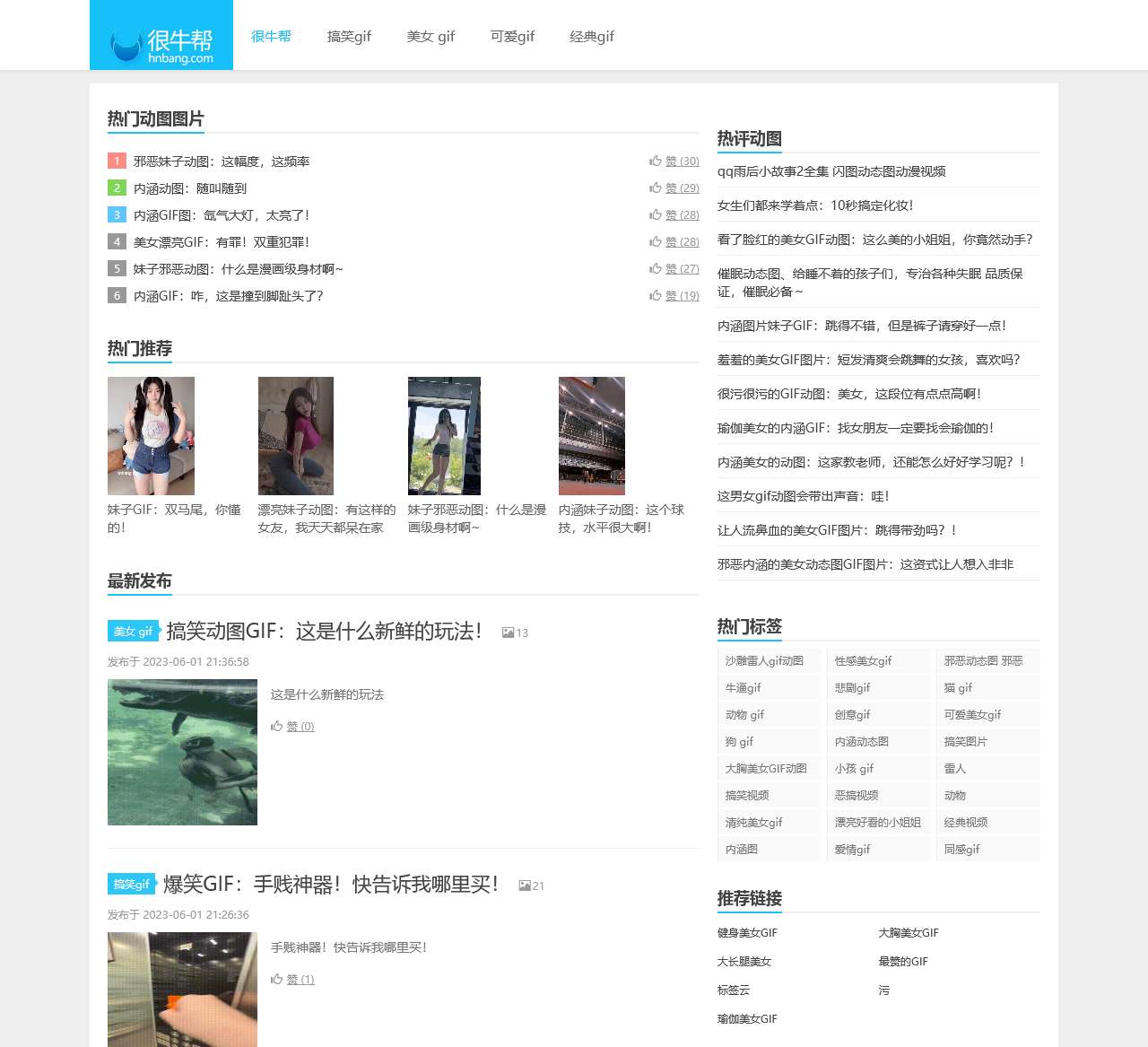 很牛帮网站首页的内容显示了网站提供的各种类型的动图。其中包括搞笑GIF、美女GIF、邪恶GIF、经典GIF等。这些动图通过妹子、内涵、猫、狗、动物等各种元素展示,给人带来欢乐和娱乐。