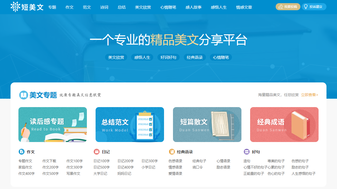 短美文网提供了丰富的美文资源,让人们可以在平凡的学习、工作和生活中感受到美的力量。网站首页的内容可以分为几个主要分类,包括专题作文、范文、诗词、总结、美文欣赏、心情随笔、感人故事、感悟人生、情感文章等等。