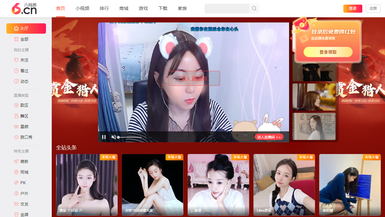 在登录和注册按钮下方,是一些分类标签,包括”歌区”、”舞区”、”星颜”、”脱口秀”、”萌新”、”同城”、”PK”、”户外”、”交友”、”金牌”、”才艺”、”气质”、”福利”、”回放”和”其他”。这些标签显示了网站提供的各种不同的娱乐内容和活动,涵盖了音乐、舞蹈、表演、户外活动等多个领域。