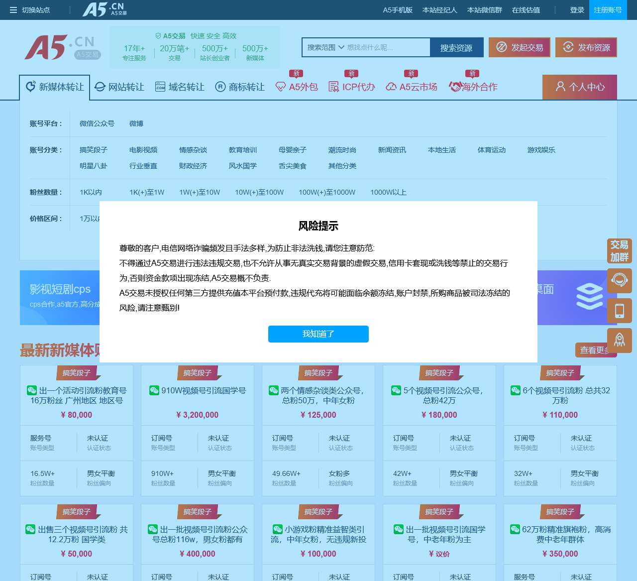 A5交易(www.a5.net),互联网资源交易平台,提供域名网站、新媒体、商标、网店等交易服务。