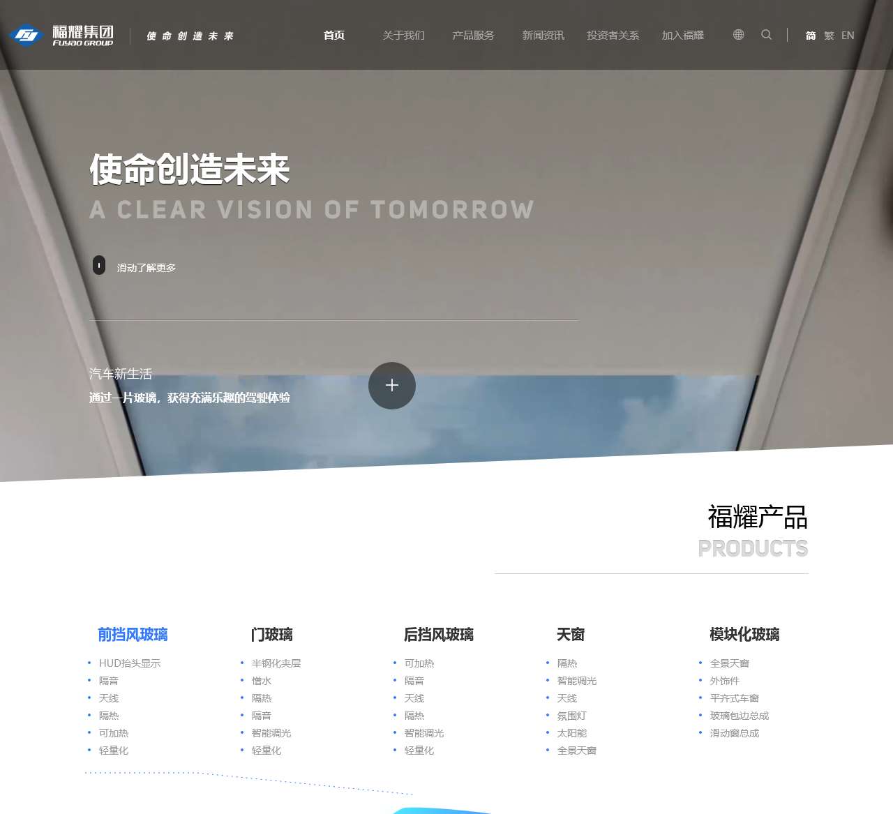 福耀集团是一家专注于汽车配件玻璃的全球领先企业。我们致力于为用户提供安全舒服、智能控制、节能环保和美观时尚的产品和服务。