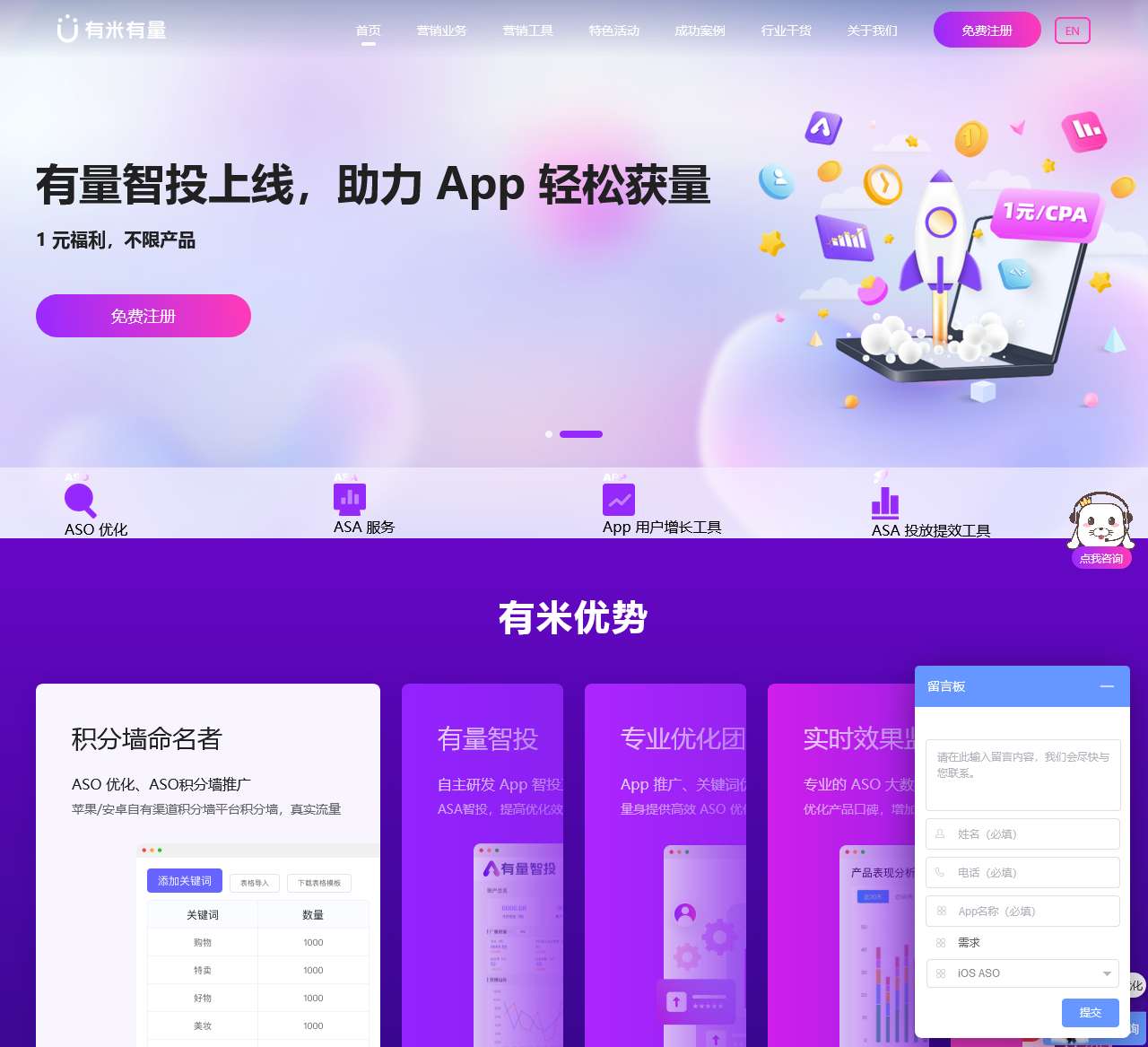 有米ASO、有量ASA、App全案营销推广专家,十二年App推广经验。专注ASO优化、ASA智投、App关键词优化、App拉新、iOS积分墙优化、苹果安卓应用商店推广优化,提升App基础数据和表现,打造专属App推广方案,应用商店优化帮助客户实现用户增长.
