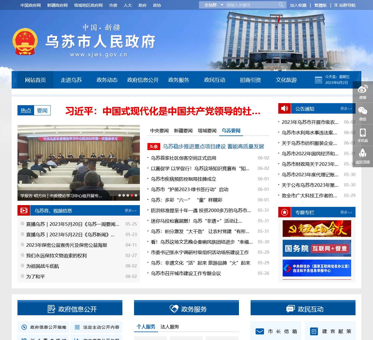 网站首页:乌苏市人民政府网站的入口页面,提供网站的主要导航和信息概览。