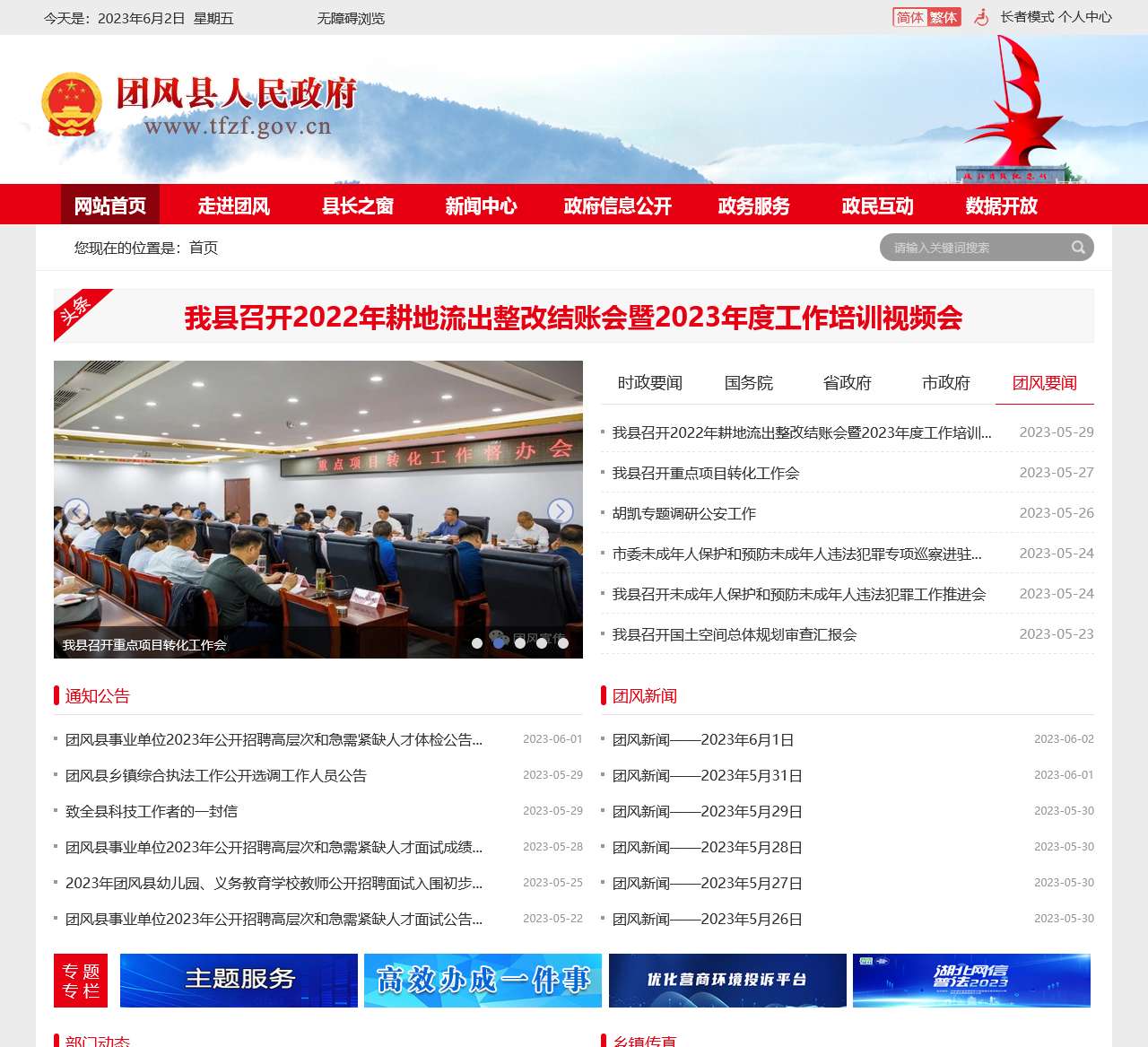 网站首页:首页提供了一个全面的概览,方便用户快速了解团风县政府的最新动态、重大新闻和热点事件。