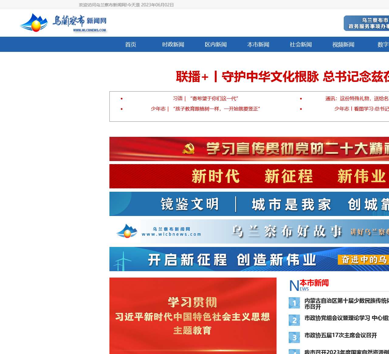 时政新闻:该栏目报道了乌兰察布地区的时政要闻和重大新闻。近期的时政新闻包括习近平总书记关于中华文化根脉的重大讲话,以及他寄予青年一代的希望和对少年儿童教育的殷切期望。