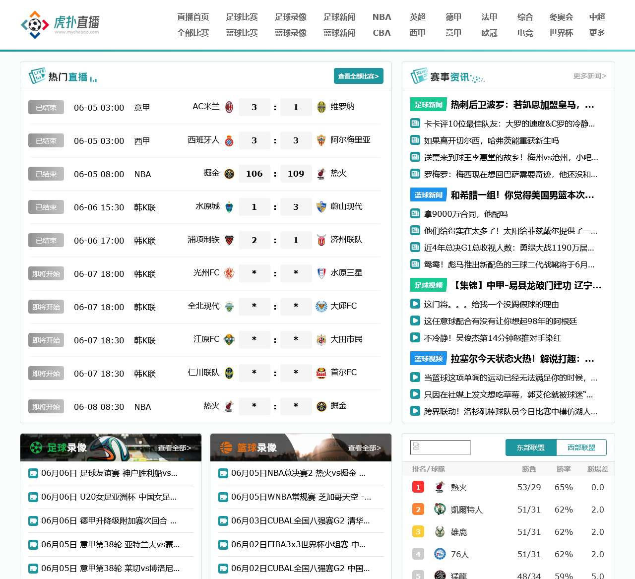 虎扑直播做全球最新最全的新闻资讯及最高清的体育直播!足球直播:世界杯、欧洲杯、欧冠、亚冠、中超、英超、德甲、西甲、意甲、法甲;篮球直播:NBA、CBA,综合直播:CCTV5、电竞、斯诺克、F1;经典视频:广州恒大、NBA录像、球星纪录片、体育教学视频、体育片段;我们努力做让球迷喜爱的体育直播网!