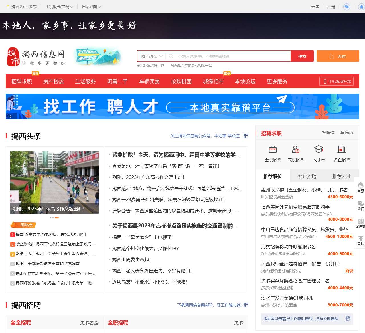 揭西信息网是一个提供丰富服务和信息的网站,致力于为用户提供最全面、最及时的本地新闻、生活服务、招聘求职、房产楼盘、闲置二手、车辆买卖、抢购拼团、城缘相亲以及其他更多服务的平台。