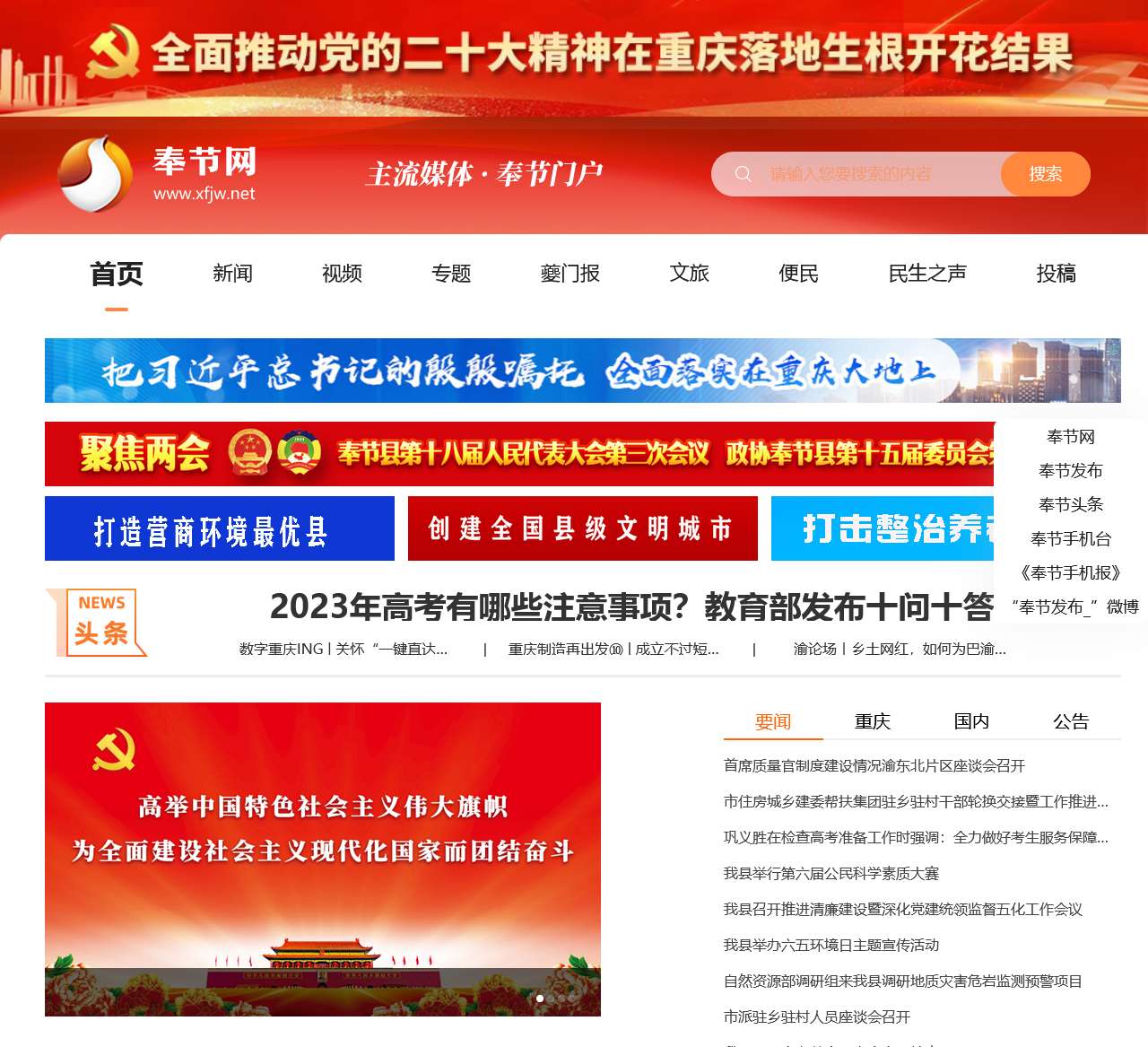 中国奉节网是一个综合性新闻门户网站,提供最新的新闻、视频、专题、夔门报、文旅、便民和民生之声等内容。以下是该网站首页的内容整理: