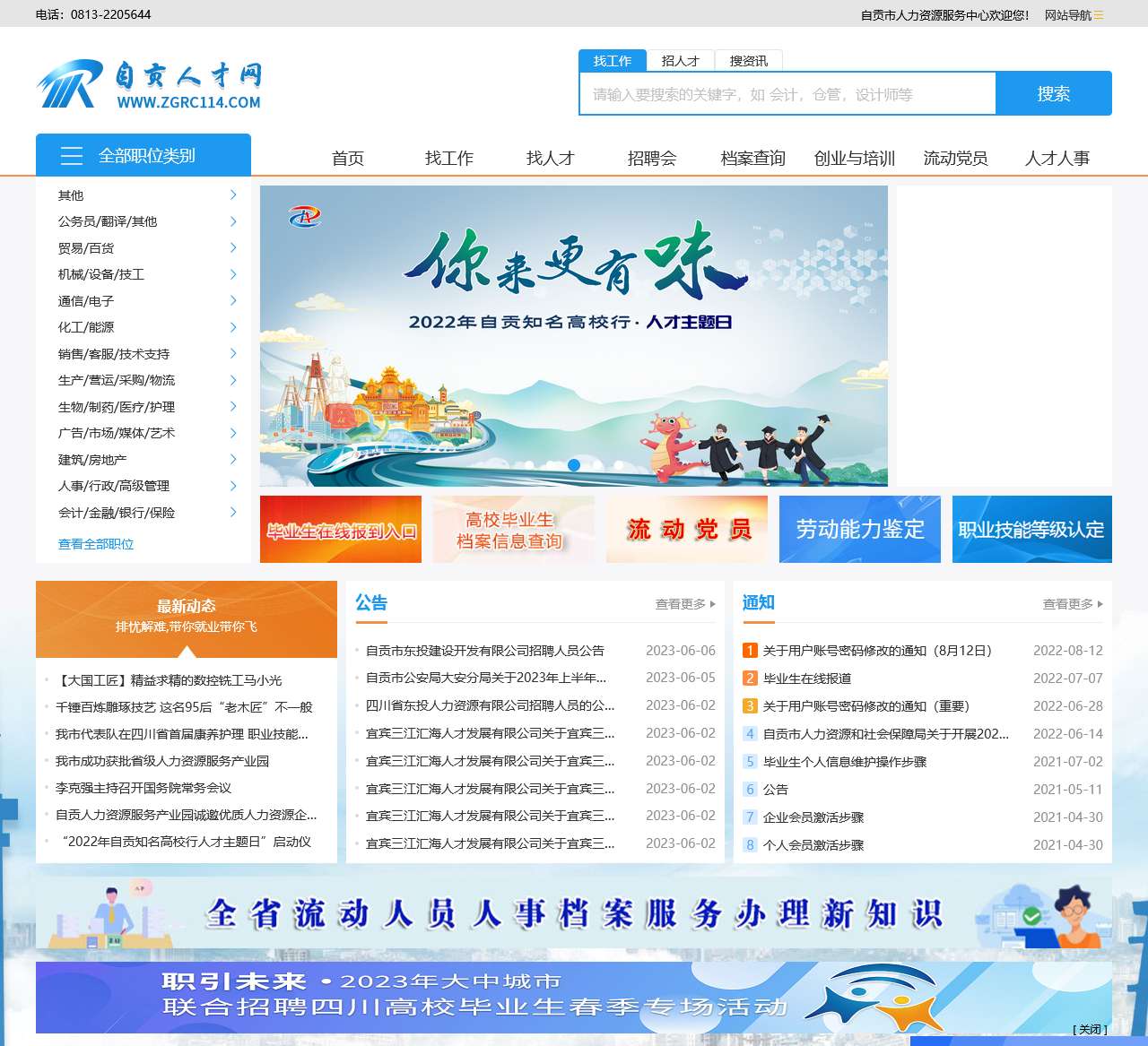 自贡人才网(自贡114人才网)是自贡市人力资源服务中心官方网站,主要发布自贡招聘、自贡求职及人事人才信息,为单位提供网络招聘、自贡招聘会、委托招聘、人才派遣、自贡猎头、培训测评、人事代理等服务,同时也是求职者在自贡找工作的首选网站之一。