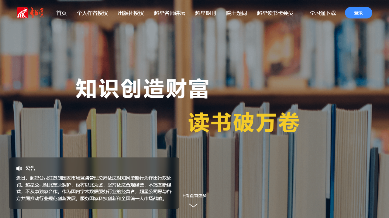 超星网是一个以知识创造财富为理念的网站,致力于为用户提供优质的学习资源和服务。我们拥有个人作者授权和出版社授权的内容,确保提供权威可靠的学习资料。以下是超星网首页的一些主要内容: