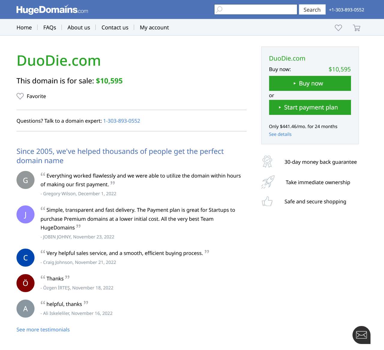100% satisfaction guaranteed on every domain we sell. 30-day, no questions asked, money-back guarantee. Easy, fast and convenient shopping.