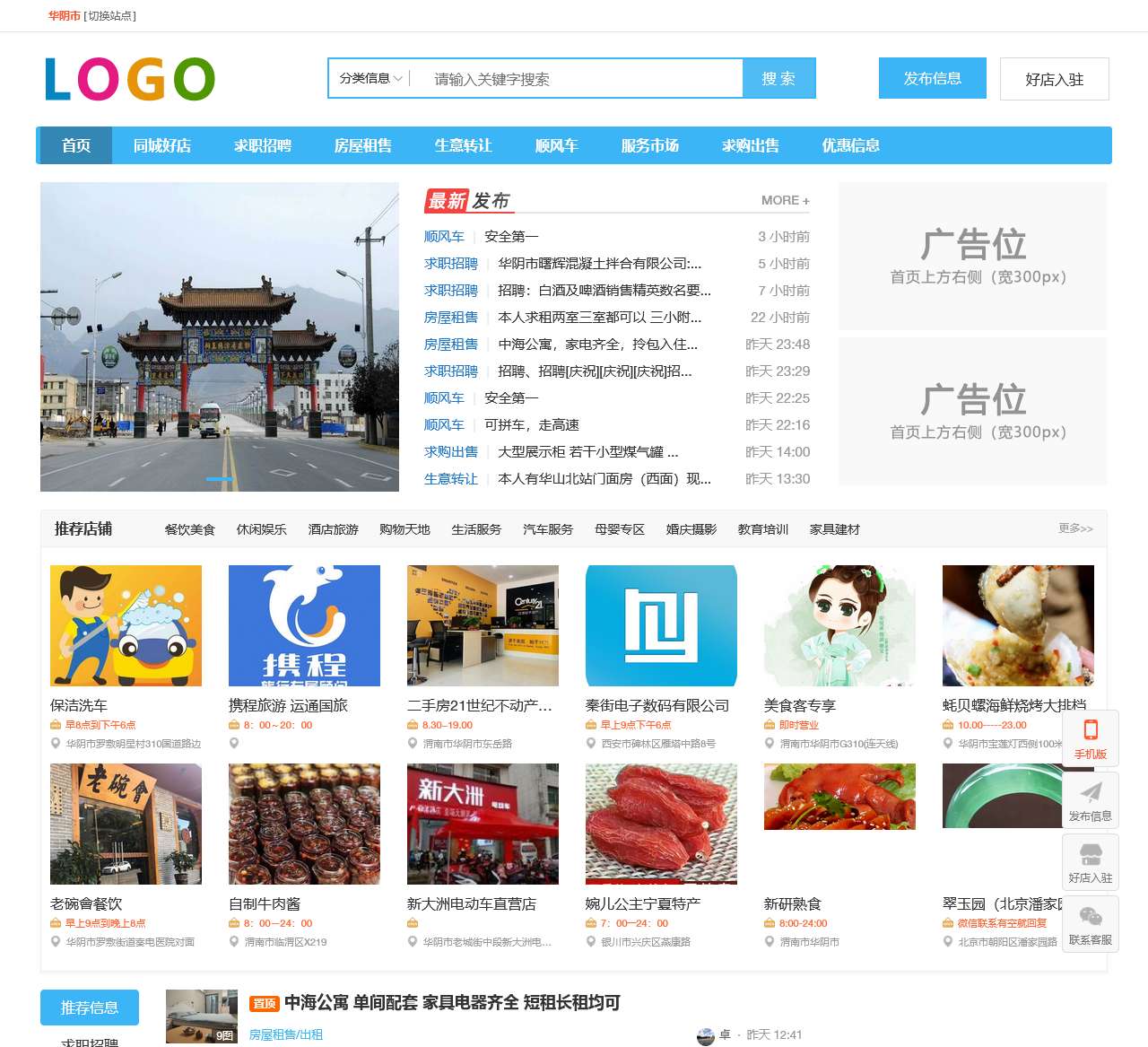 华阴门户网是一家提供全国各地信息的网站,主要涵盖了渭南市华阴市及周边地区的信息。该网站提供了各类分类信息,包括同城好店、求职招聘、房屋租售、生意转让、顺风车、服务市场、求购出售、优惠信息等。以下是一些重大的分类信息: