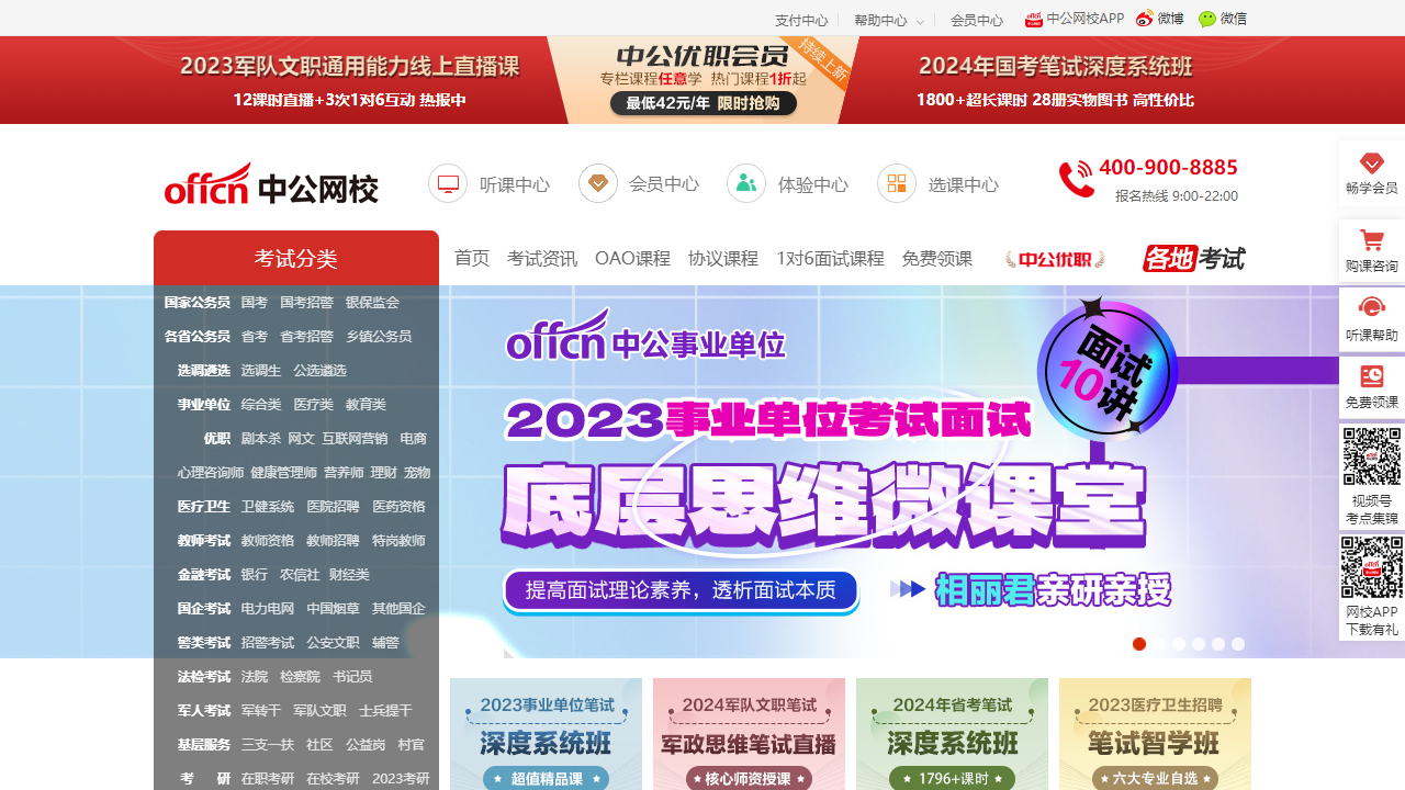 最后,首页上还展示了一些即将开设的课程,例如”2023军队文职通用能力线上直播课”和”