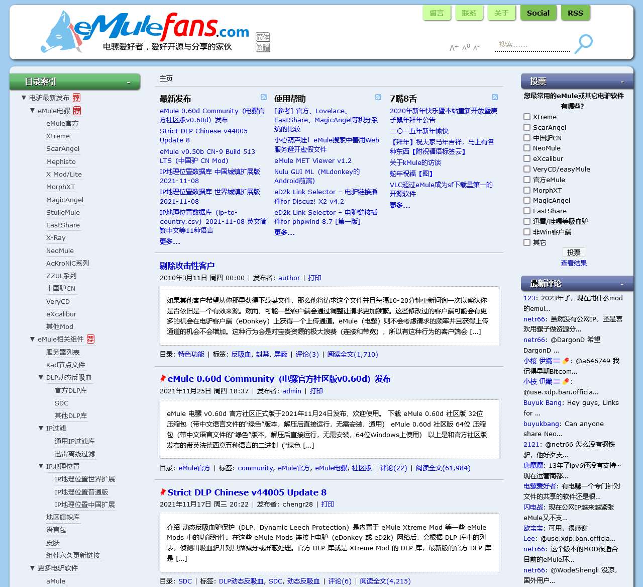 一个发表eMule(电骡)官方版本、Xtreme等Mod和其他一些eDonkey(电驴)网络客户端的最新发布消息与软件下载、eMule设置帮助、最新eMule服务器列表和IP数据库等内容的多人blog。
