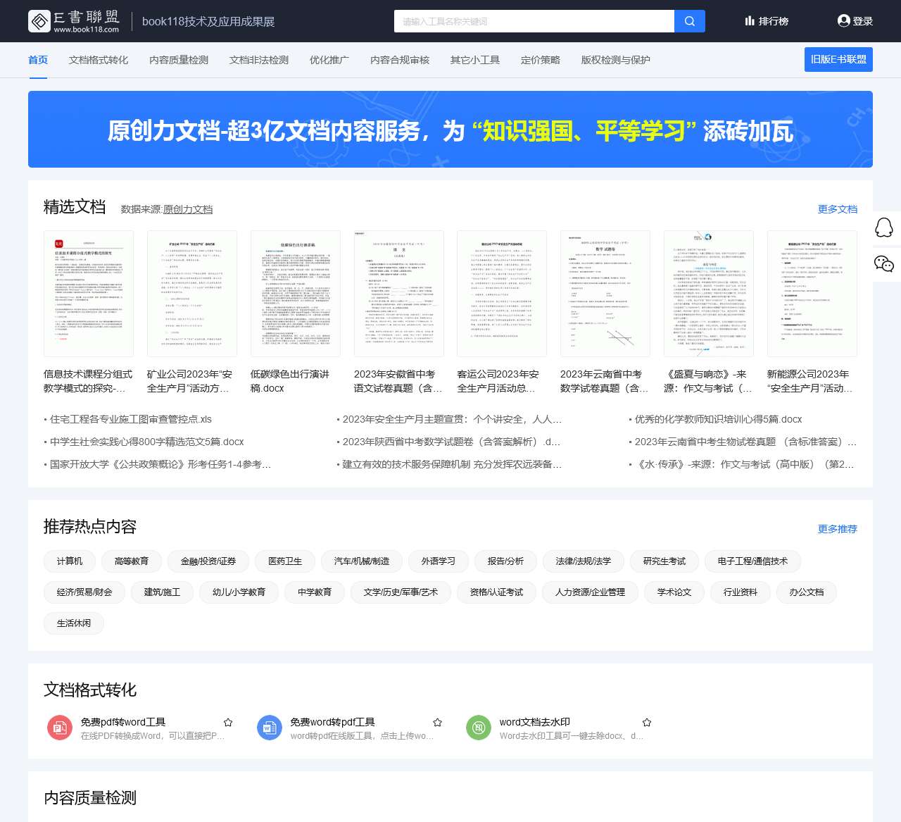 E书联盟提供了文档网现有的技术、业务成果,提供了一系列在线文档工具,包含有在线PDF转换成Word转换器,内容非法检测,色情检测,宗教检测,政府公文检测,垃圾检测,文档原创度检测,文档重复检测, 标题重复检测,收录分析,排名分析,竞品分析,唯一性分析,长尾关键词推荐,文档需求挖掘,文档价格预测,智能定价,原创检测,侵权检测/通知删除,版权登记,区块链存证,论文查重,论文降重,批量去水印,洗文工具