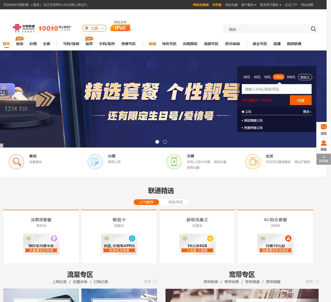 办理:用户可以在线办理各类业务,如套餐变更、号码选购、流量包订购等。