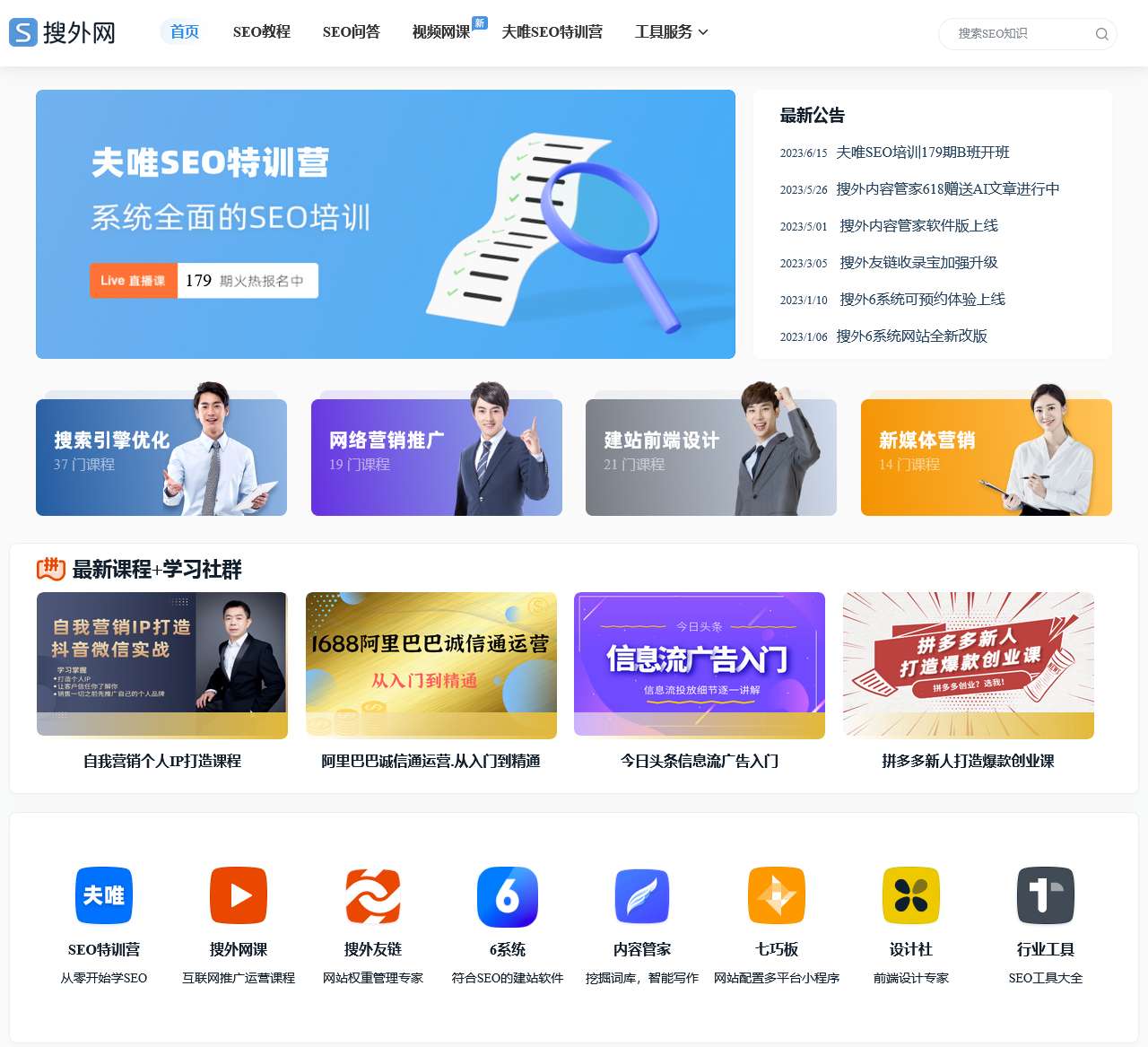 搜外网专注SEO培训以及网络营销技术视频网课。为广大站长提供SEO系统技术知识学习,掌握搜索引擎排名流量的获取技术。新增Google独立站SEO,另提供符合SEO优化的6系统、友链交换的搜外友链。