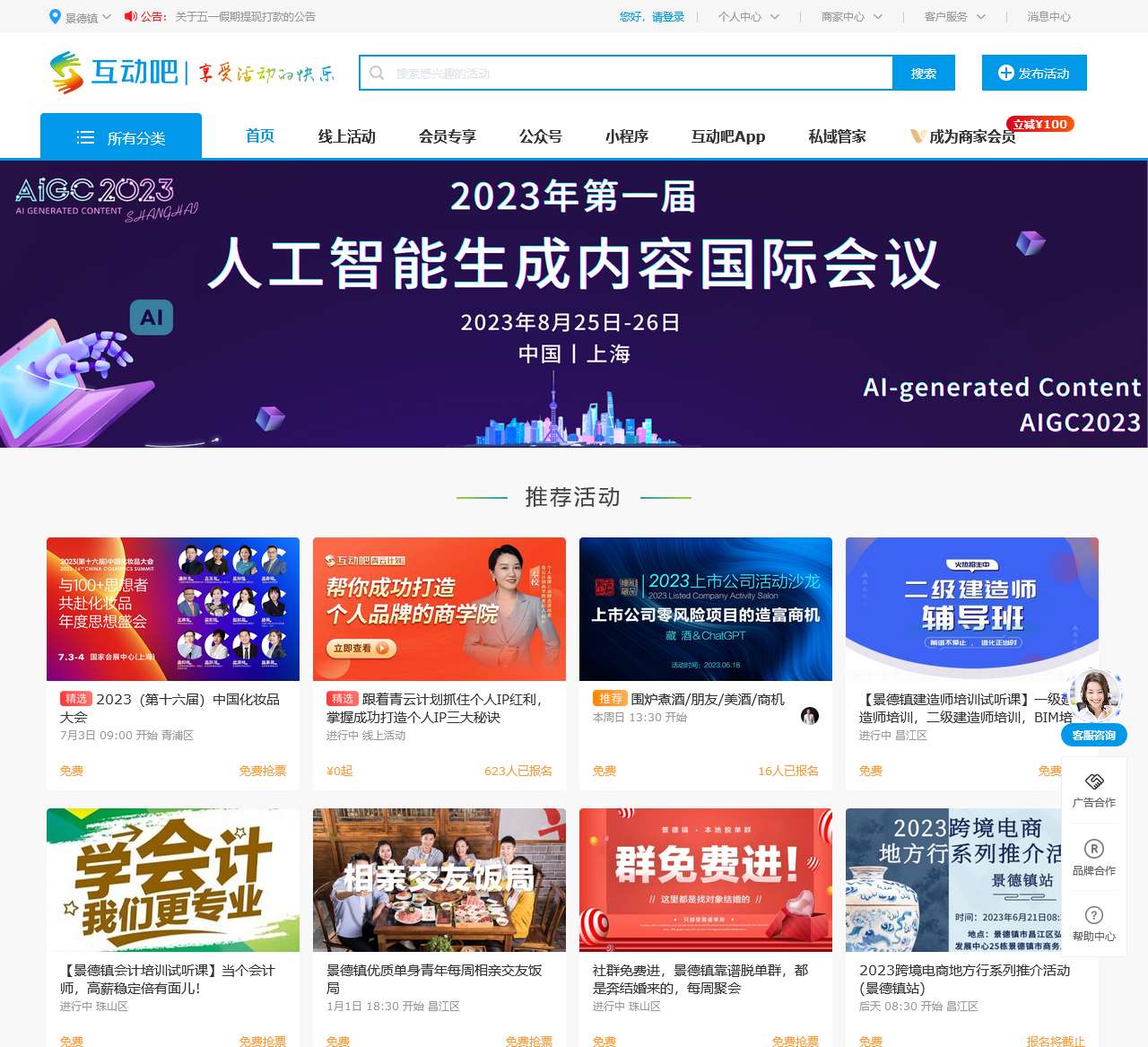 景德镇互动吧活动平台,为您提供景德镇活动宣传、活动策划、会议营销等多种行业活动的报名与发布,是景德镇一站式综合活动服务平台。找活动,办活动就来互动吧!