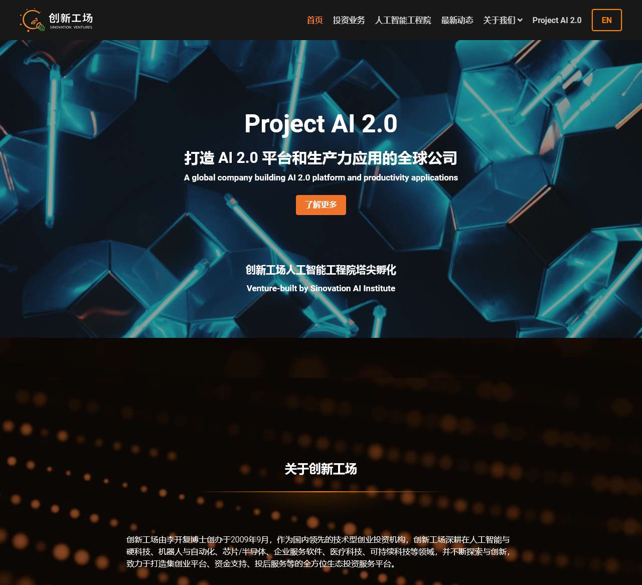 创新工场是一家致力于投资业务、人工智能工程院、创业服务以及企业责任宣言的公司。我们的团队致力于推动创新和科技的发展,并为创业者提供支持和指导。通过Project AI 2.0,我们正在打造新一代人工智能平台,重塑各行各业的应用方式。